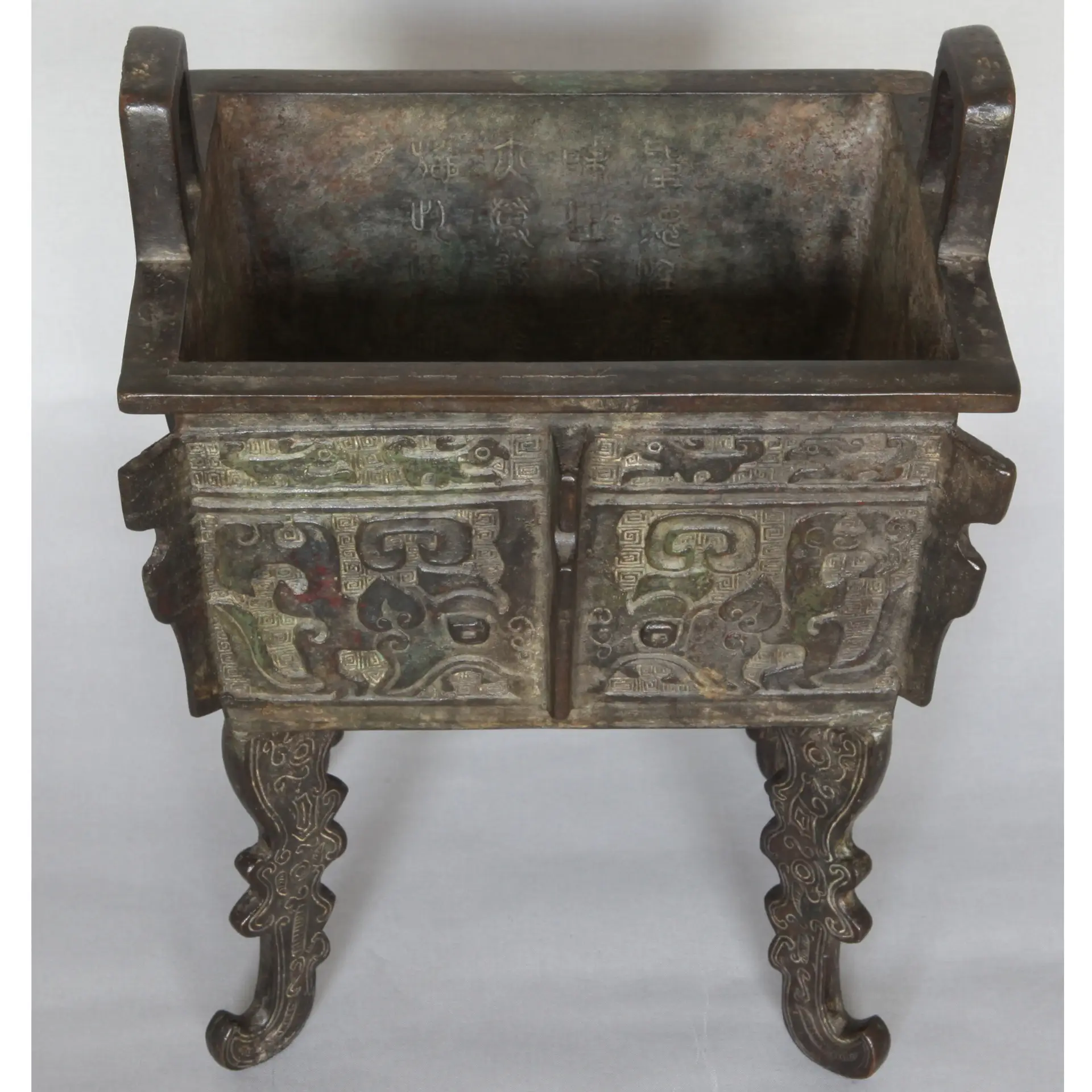 FANGDING, RITUAL FOODVESSELBRONZEMING DYNASTY 17TH CENTURY明期inscription-VIRTUE OF THE HOLY MAN (CONFUCIUS OR THE EMPEROR) IS ENDLESS, … GREAT BEAUTY, ALSO NO ONE WILL SPEAK EVIL AND (THEREFORE) THE ‘DING’ RECEIVED THIS INSCRIPTION